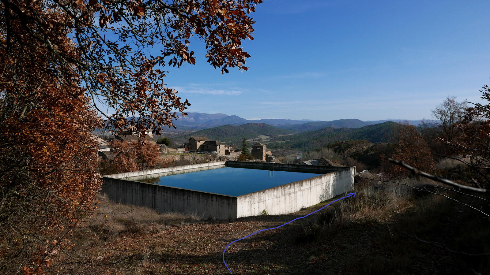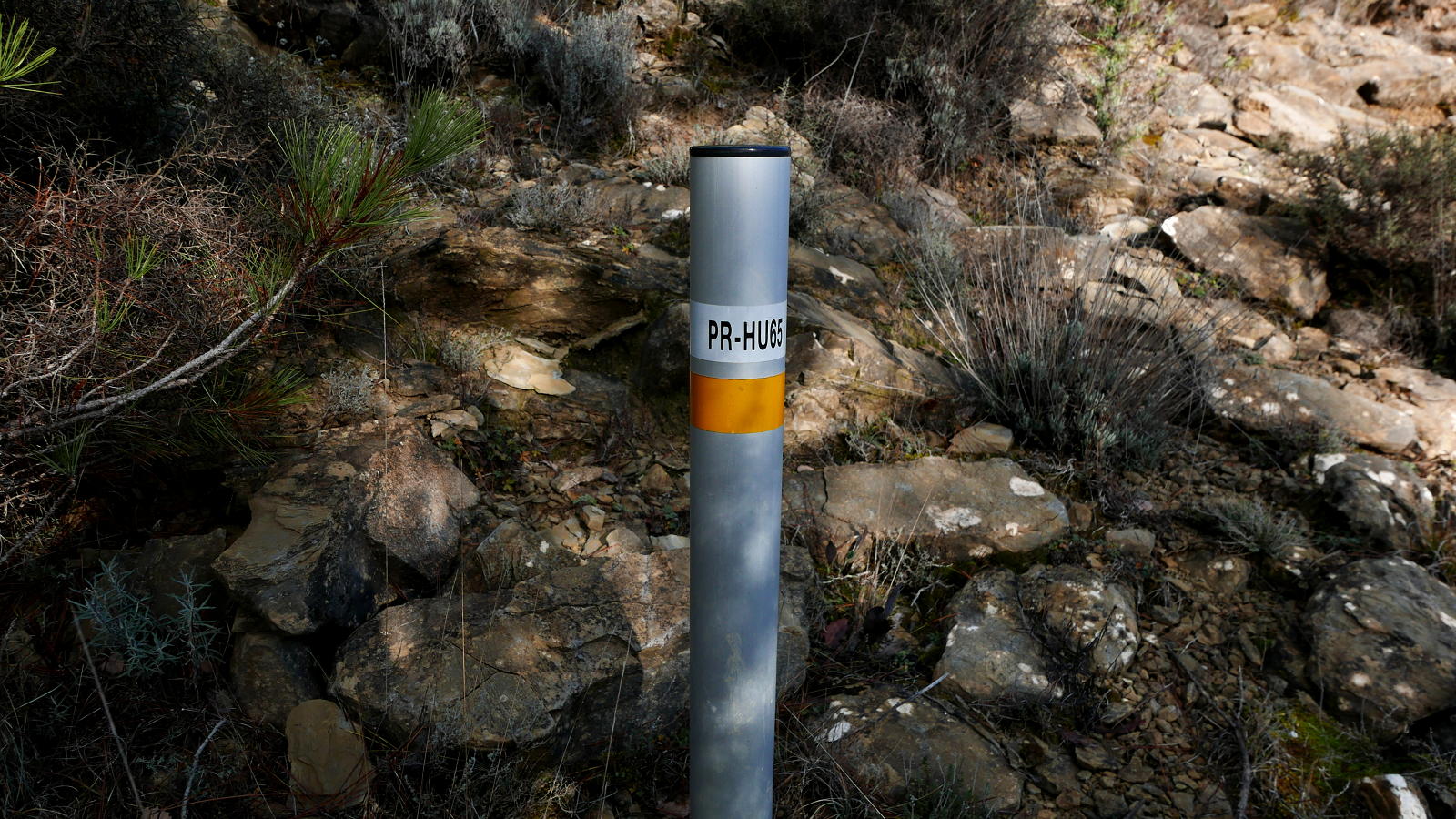 Desemboco en el PR-HU-65 (625m 3h09′)(El PR-65 es la ruta Caldearenas-Izarbe). Este punto si es de subida puede ser confuso ya que en la desviación del PR veo una marca cruzada amarilla y blanca (que significa que por ahí no va el PR) y una flecha amarilla que marca la ruta hacia Centenero. En el sentido que yo voy no hay confusión posible porque desemboco en el PR y lo tengo que seguir hacia el sur, paralelo y por encima de la carretera. Cruzo una pista (605m 3h17′), sigo el PR con flecha amarilla en sentido contrario a mi avance, llegando a la carretera (572m 3h28′) al punto de inicio.