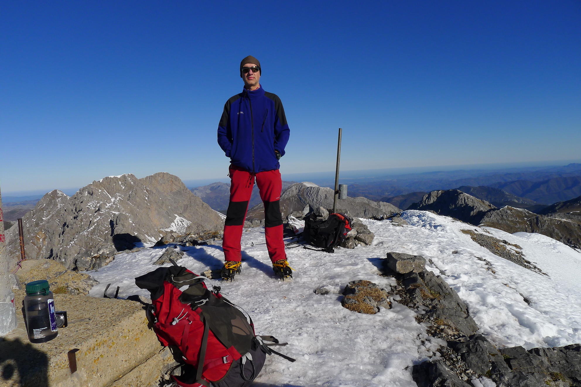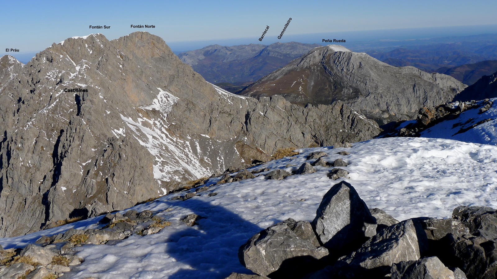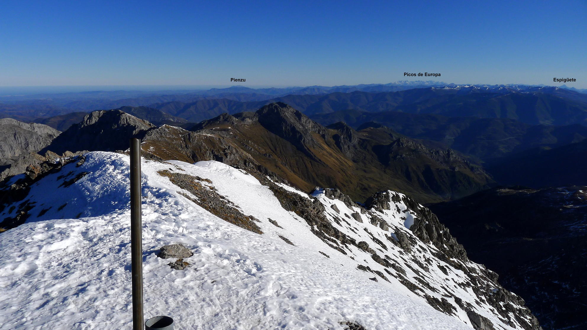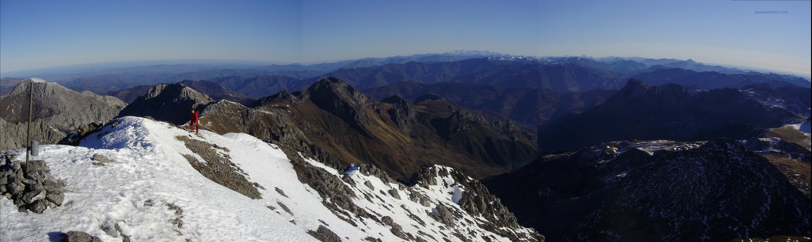 En el collado empiezo a recibir los primeros rayos de sol. A mi derecha una empinada cuesta de hierba y luego la mole rocosa de Peña Ubiña, que todavía no sé exactamente por dónde hay que atacar. De momento empiezo con la cuesta de hierba. La senda que asciende es impracticable porque se ha formado un barrillo resbaladizo, así que progreso por la hierba sin separarme casi del sendero. La ruta me lleva hasta un corredor de roca cubierto de nieve y se ve bastante evidente por dónde hay que subir. Vuelvo a calzar los crampones y saco el piolet. Hay una huella en la nieve, la pendiente es asequible, siempre sin perder la atención, y la nieve está en su punto para cramponear con seguridad. Me faltan algo más de 200 m. de desnivel que iré ascendiendo despacio y con cuidado. Finalmente la huella se desvía un poco hacia la derecha para alcanzar la cresta cimera unos 300 m. a la derecha de la cumbre, que ya se alcanza con facilidad (Peña Ubiña 1411m 2h50′). El día es extraordinario, ni una sola nube. En la cima hay un guía asturiano con un cliente que han subido escalando y bajarán por la misma ruta que yo.