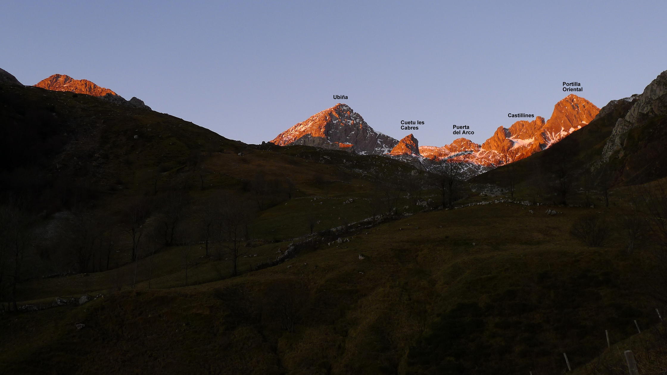 Descripción de la ruta: Desde el aparcamiento (1210m) hay que ascender unas calles empinadas y tomar como referencia el depósito de agua, porque el camino que debemos seguir pasa justo a su lado. Enseguida podemos ver la silueta de Peña Ubiña iluminándose al amanecer.