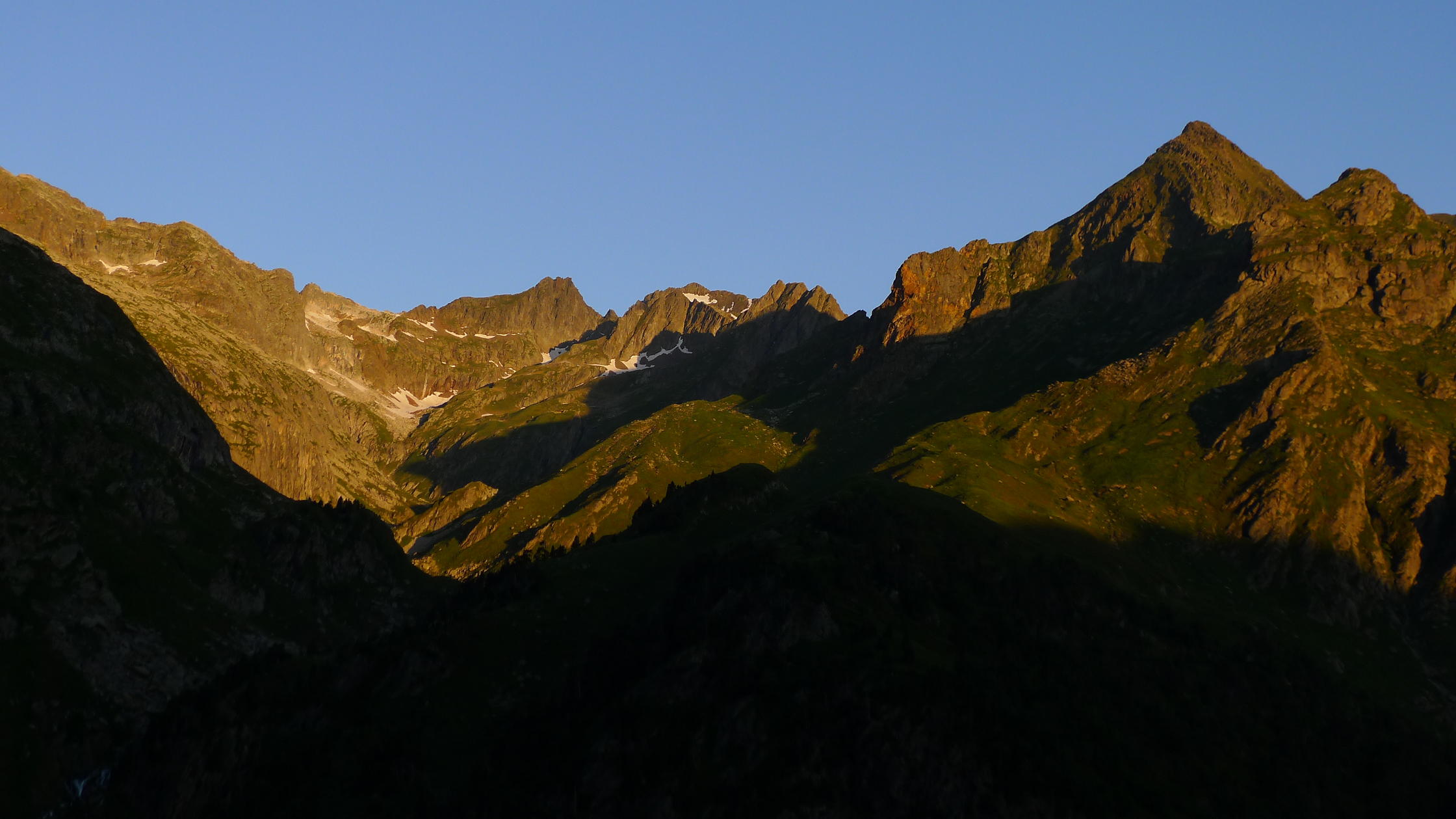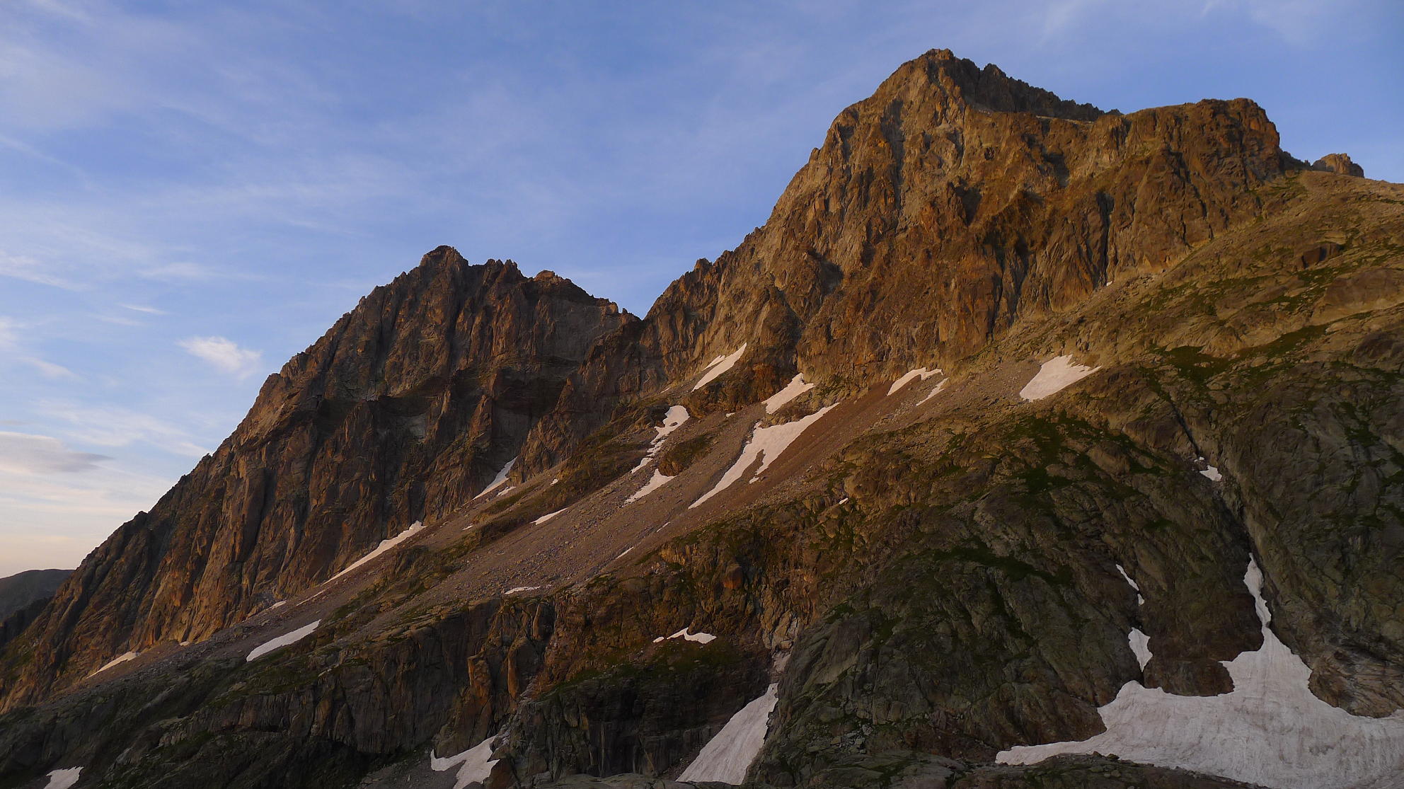 El descenso es una cuestión de atención y sangre fría. Quizá una buena idea habría sido dejar las mochilas en la base de la chimenea para subir y bajar más ligeros. El descenso al refugio tardamos 1h45’. El atardecer nos ofrece una visión de los picos que nos rodean con una luz que les da una nueva dimensión. Por cierto, la cena en el refugio estupenda, pero la previsión del tiempo muy mala. Nos dicen que al día siguiente lloverá desde por la mañana y eso hace que cambiemos el plan de subir el Gourdon, Spijeoles, Belloc por descender directamente hacia el coche.