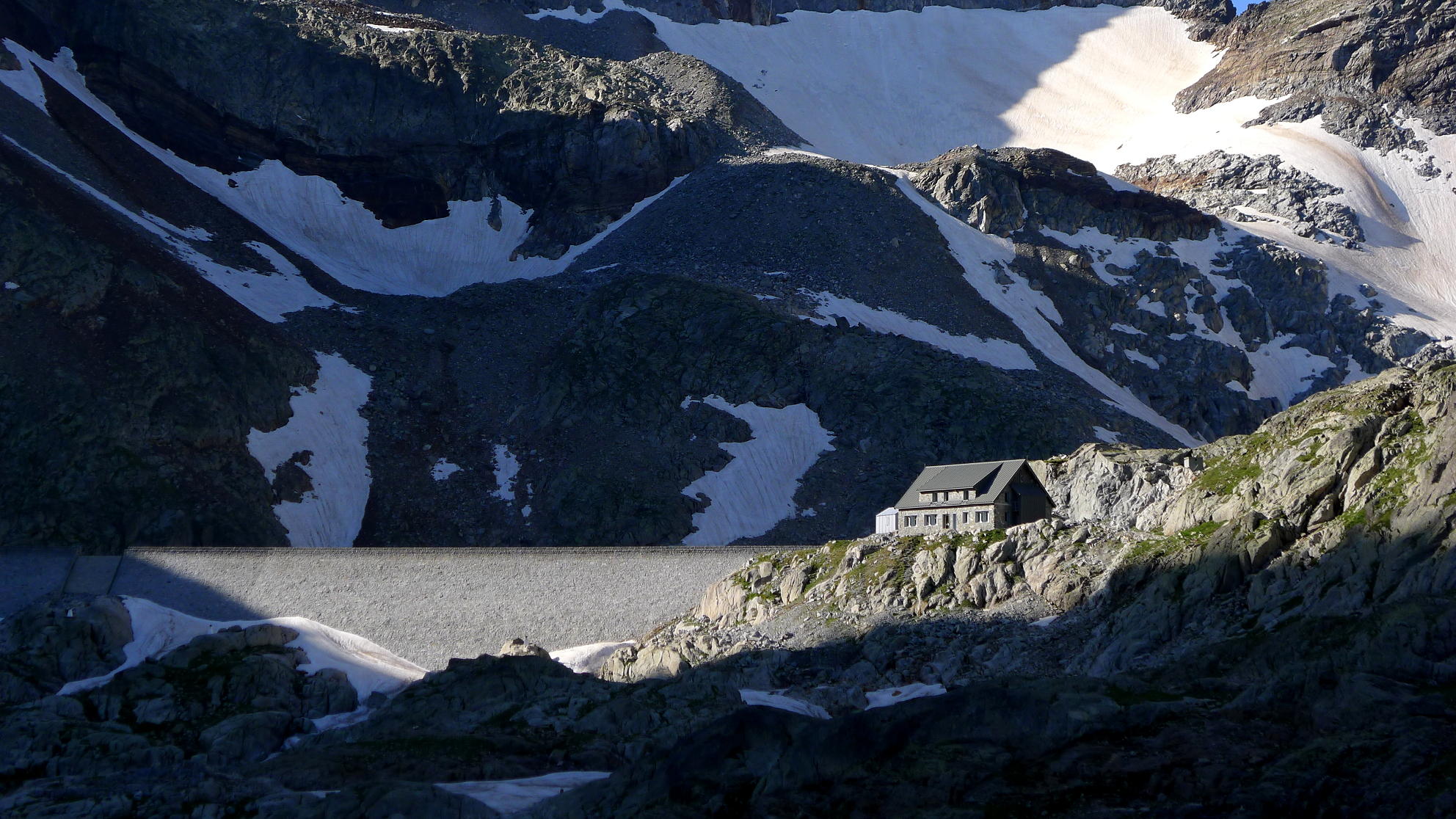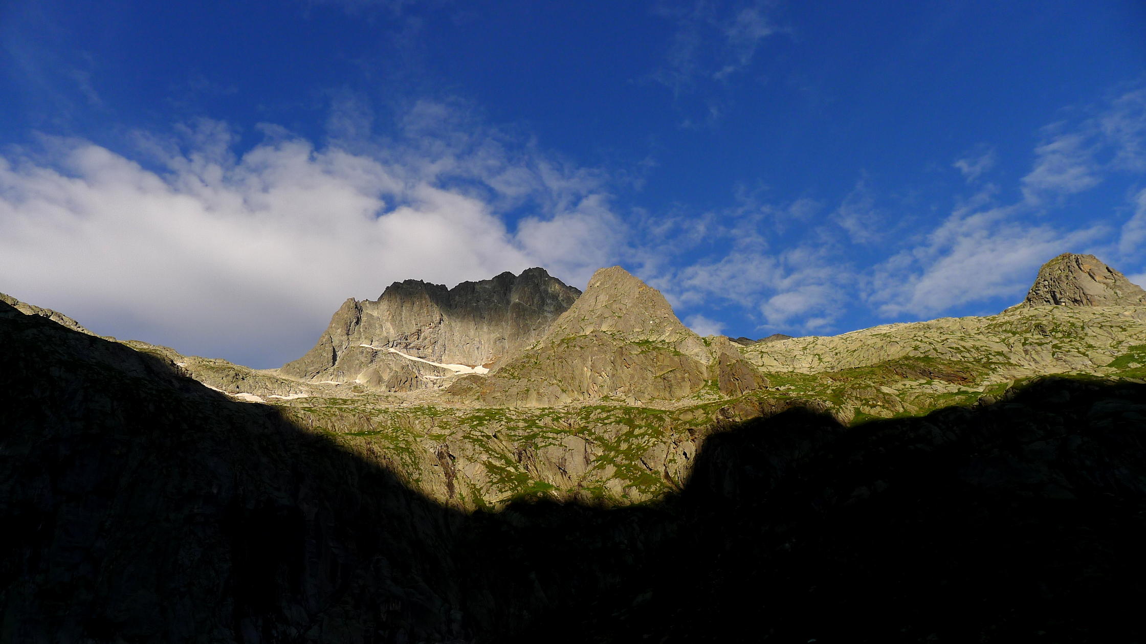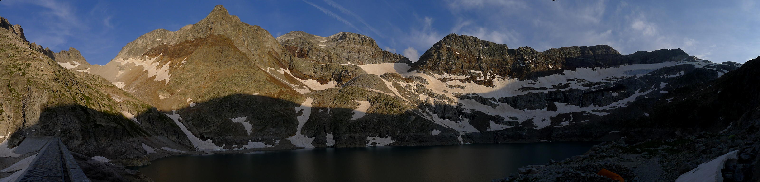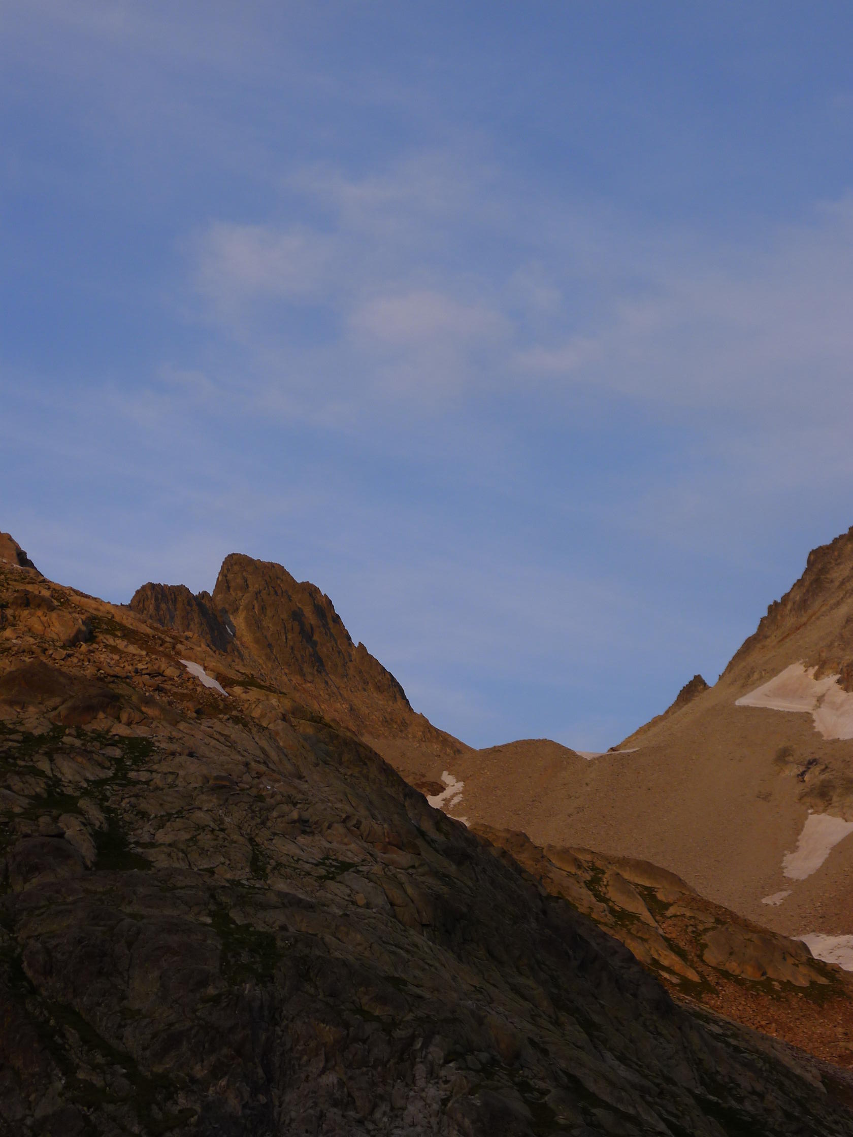 El camino del refugio de Espingo (1965m) al del Portillon o Jean Arlod es un precioso sendero empedrado de losas en gran parte del recorrido, pasando junto a lagos y cascadas y ofreciéndonos vistas de los portentosos picos que nos rodean con la luz del amanecer. La primera parte del valle de Espingo es verde y herbosa, para luego pasar al rocoso circo del Portillon. (Refugio Portillon 2570m 2h12’) Allí dejamos también parte del peso, aunque llevamos en las mochilas piolet y crampones.