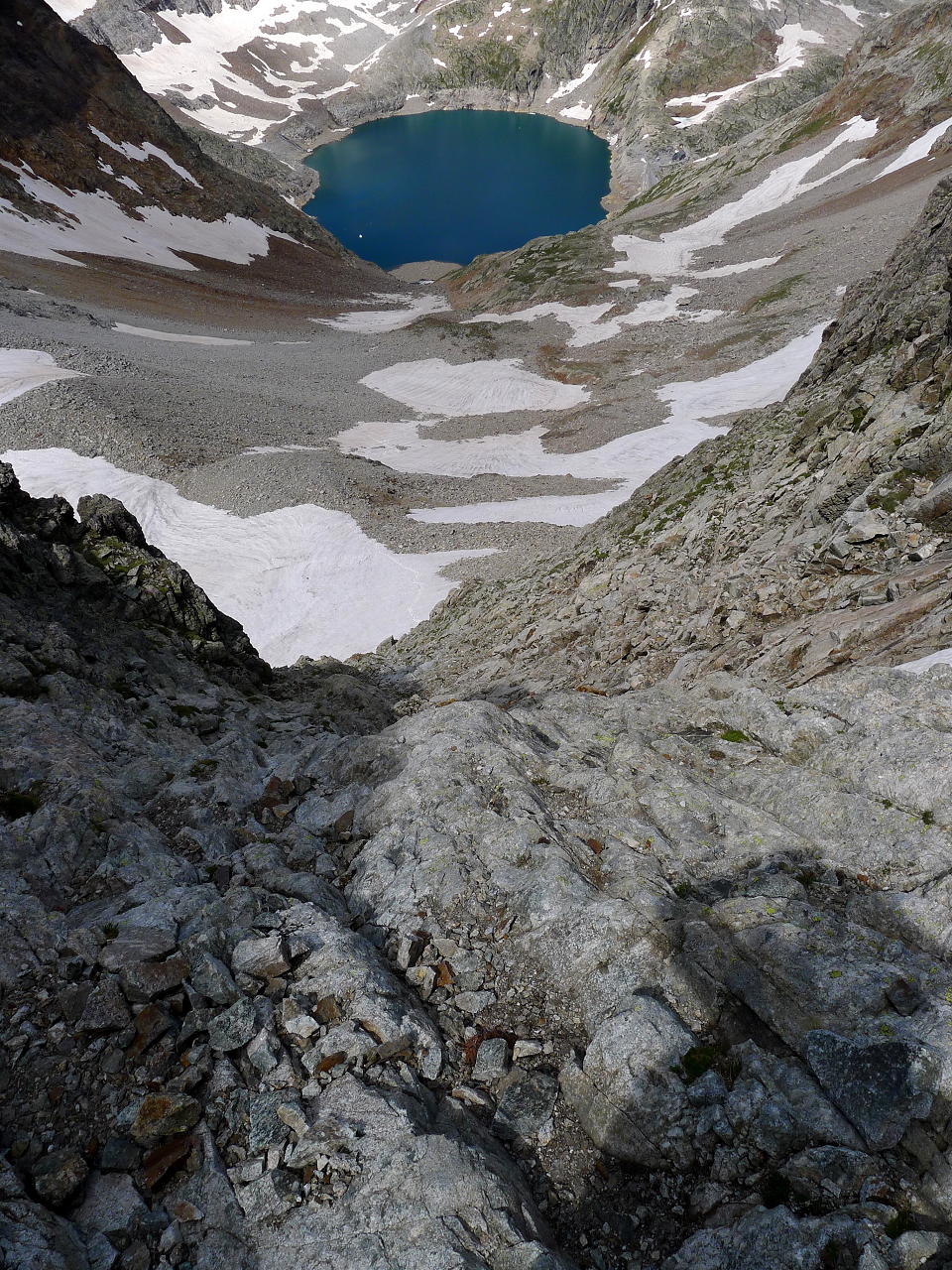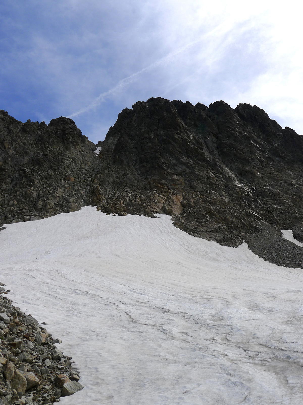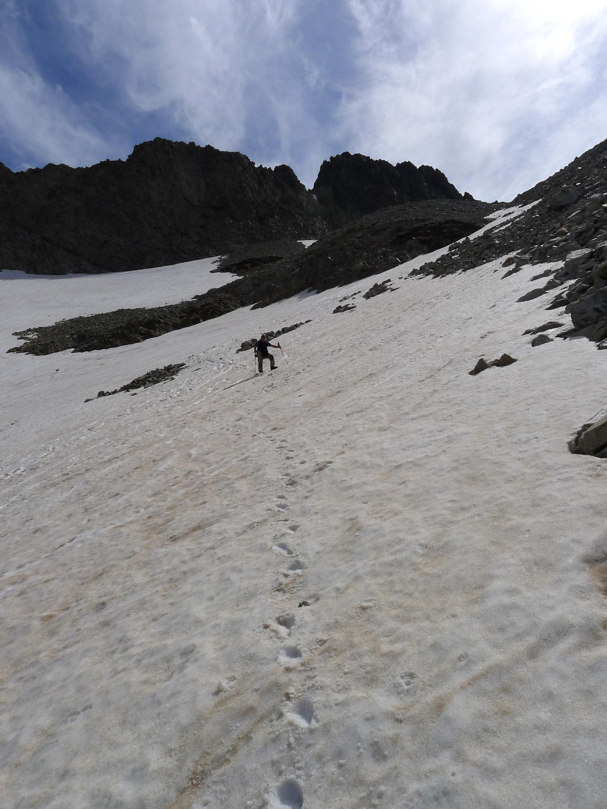 Se va ascendiendo todo este valle por senda y siguiendo hitos, con algunos neveros que se pasan con facilidad. Al llegar a un falso collado, que en realidad es una morrena glaciar, vemos enfrente el collado de Literola y nos vamos a la izquierda hacia la base de una clara chimenea que culmina en la brecha Mamy, con la punta Mamy a su izquierda y el Crabioules a su derecha. La visión del recorrido que nos queda, la chimenea, la pared del Crabioules y la cresta, imponen respeto.