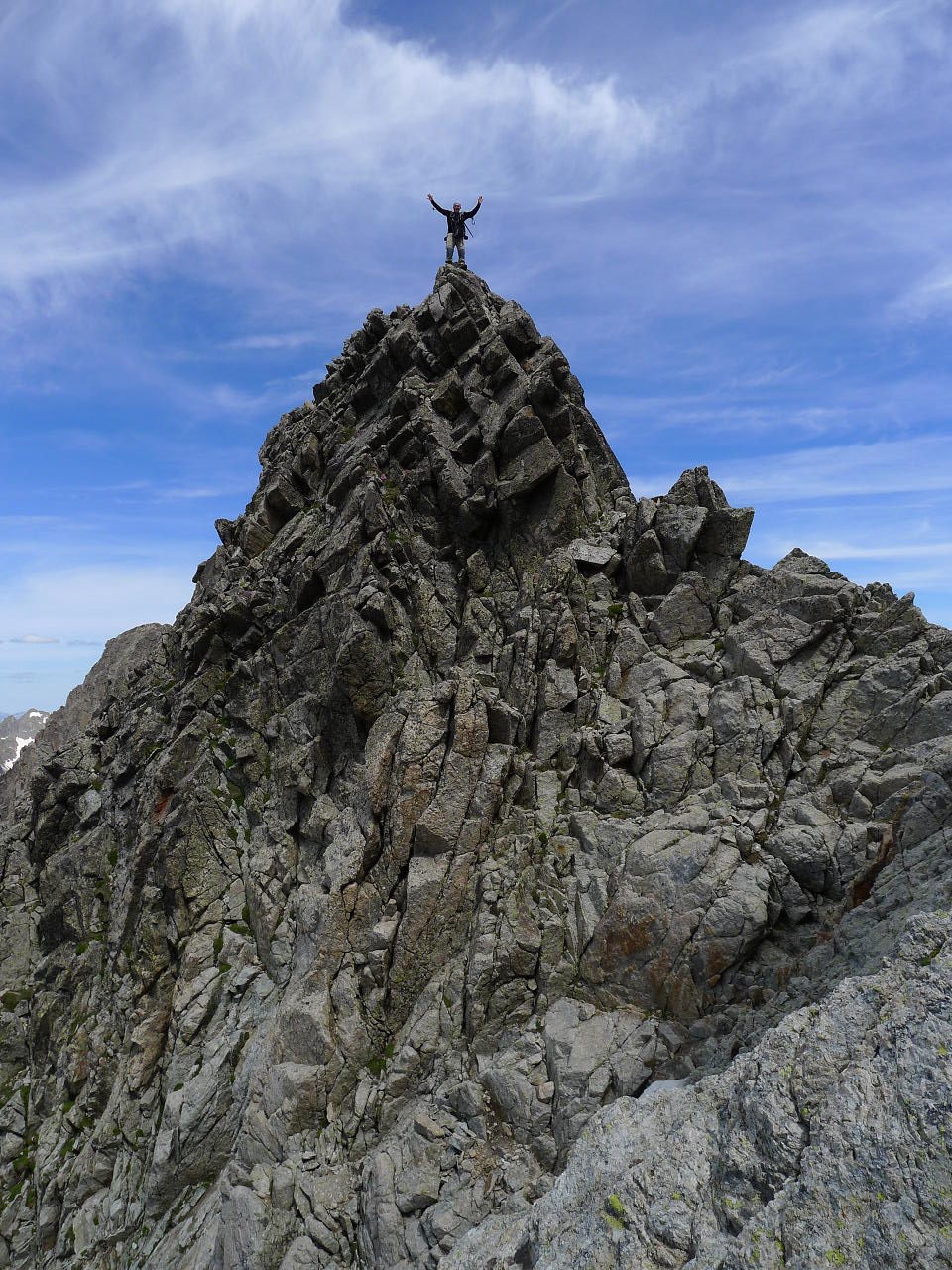 Para llegar a la base de la chimenea hay que pasar un nevero bastante inclinado que requiere piolet. Colocados ya en la base comienza la trepada que va a ser constantemente I+ y II hasta la cumbre. Al llegar a la brecha Murciano escala la punta Mamy, yo sigo por la pared sur del Crabioules ascendiendo con precaución. Hay hitos de vez en cuando. Esta zona me parece la más delicada, incluso hay un par de pasos que puede que sean II+ y en uno de ellos Murciano me tiene que ayudar en el descenso. Finalmente llegamos a la cresta, donde es preferible no mirar mucho a los lados porque ambos son vertiginosos, sobre todo la verticalidad de la cara norte donde hay una caída directa de más de 300m. hacia el circo de Crabioules. Como dice Murciano si te caes aquí ya no te caes más veces, así que la atención en cada paso es máxima.