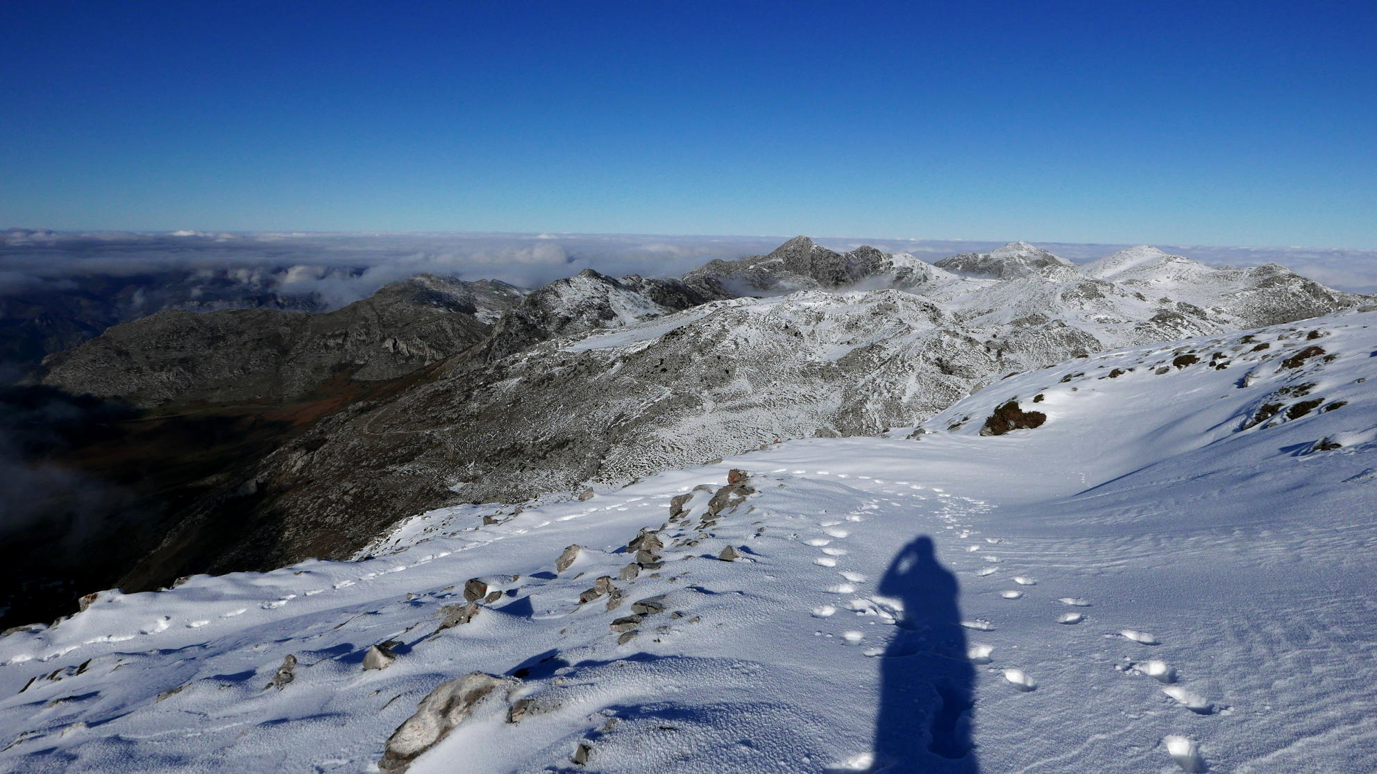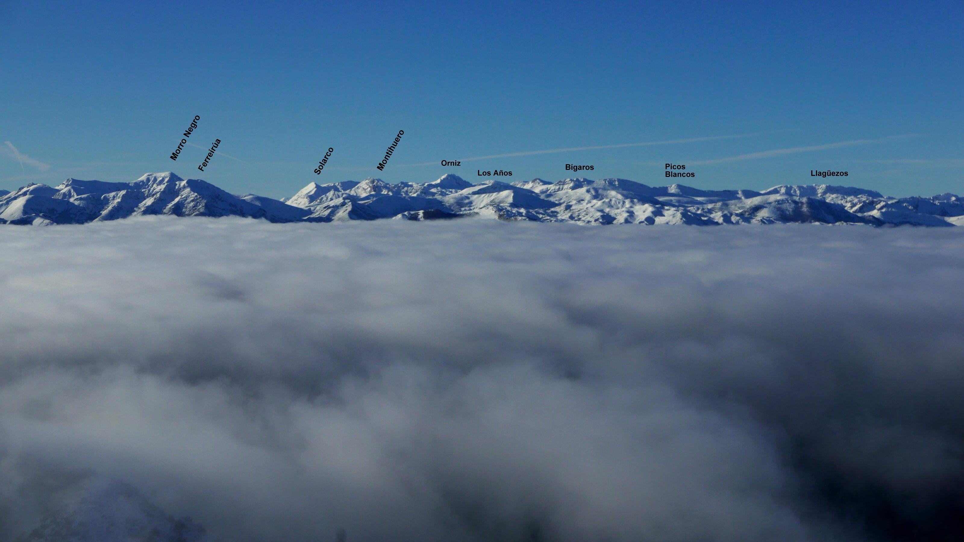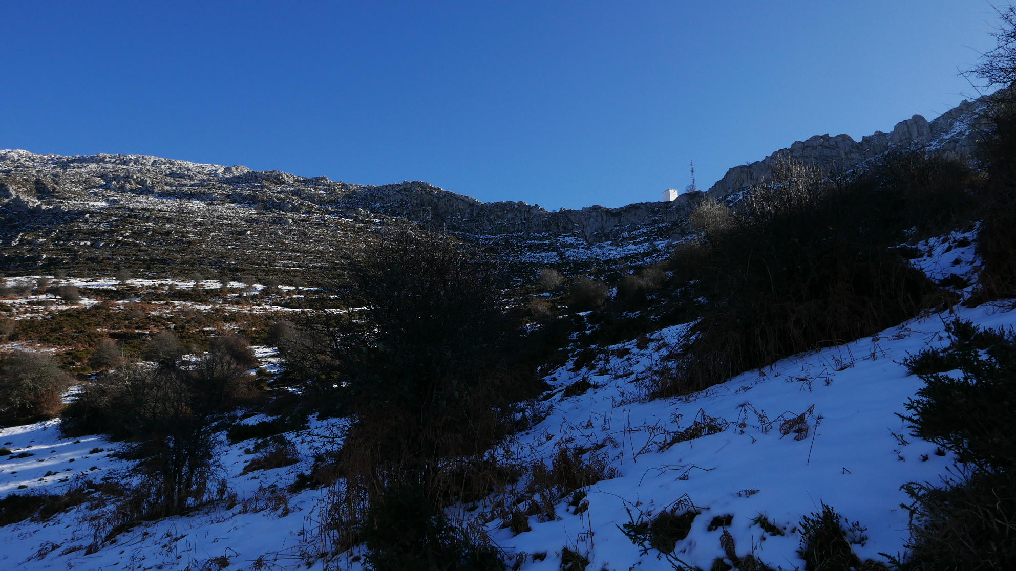Parece que hay traza de senda que se dirige hacia el collado entre el Gamoniteiro y Peña Podre, pero entre la nieve y la vegetación no se distingue y voy subiendo intuitivamente por donde me parece el mejor trazado. Además la niebla empieza a cerrar la visibilidad. Antes de llegar a una pared rocosa me voy yendo a la izquierda por lo que parece un paso más cómodo y asciendo por traza de senda a un hombro (1560m 1h19′) y tengo una alambrada a mi derecha. Desde aquí asciendo ya directamente, con nieve a veces profunda y a paso lento, hasta la carretera que sube al Gamoniteiro, justo bajo las antenas. Aparece el sol y descubro una vista extraordinaria. Hago estos últimos metros por la carretera, con cuidado no vaya a estar helada, y asciendo al mogote donde está la cruz (Gamoniteiro 1791m 2h08′).