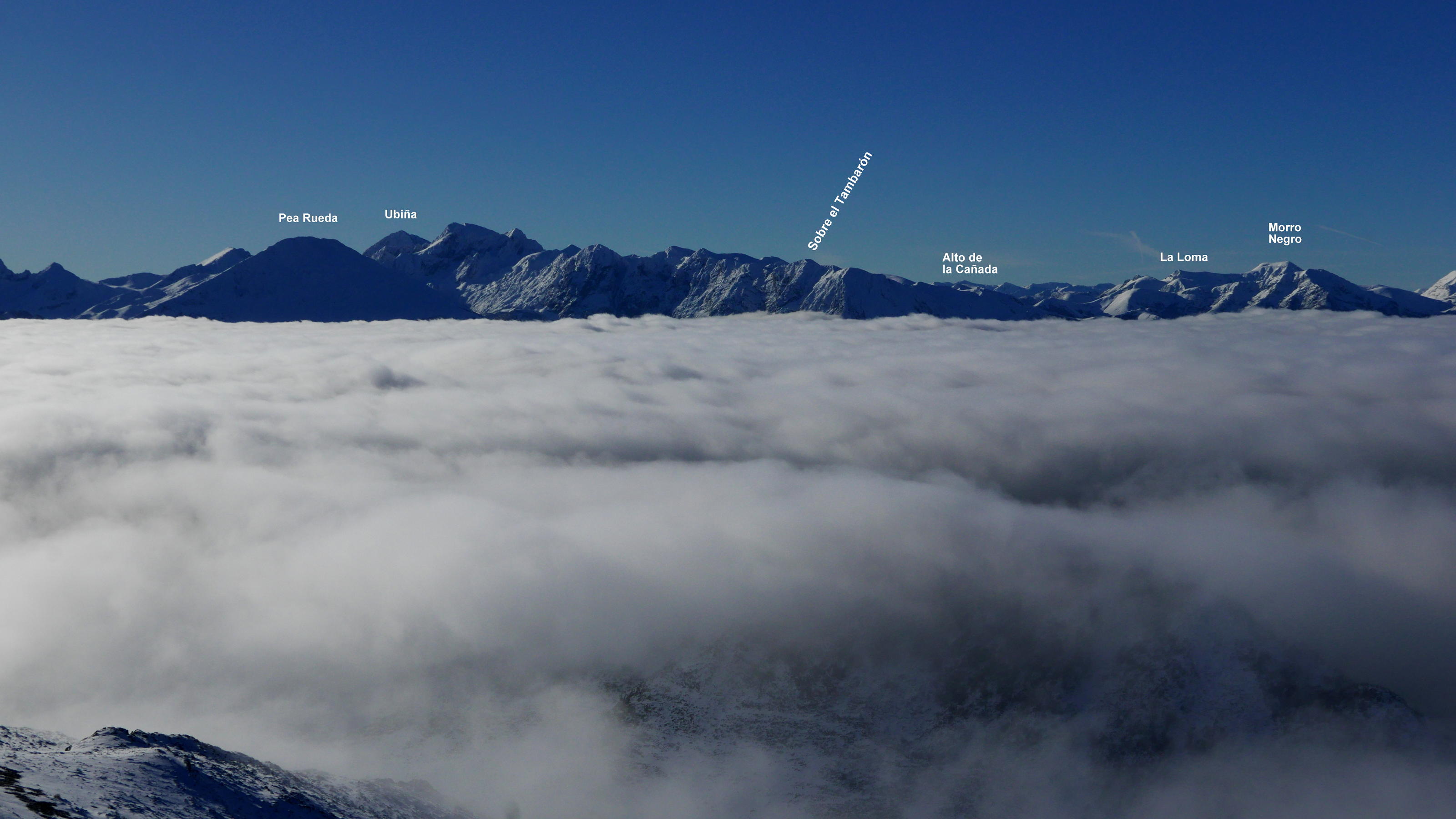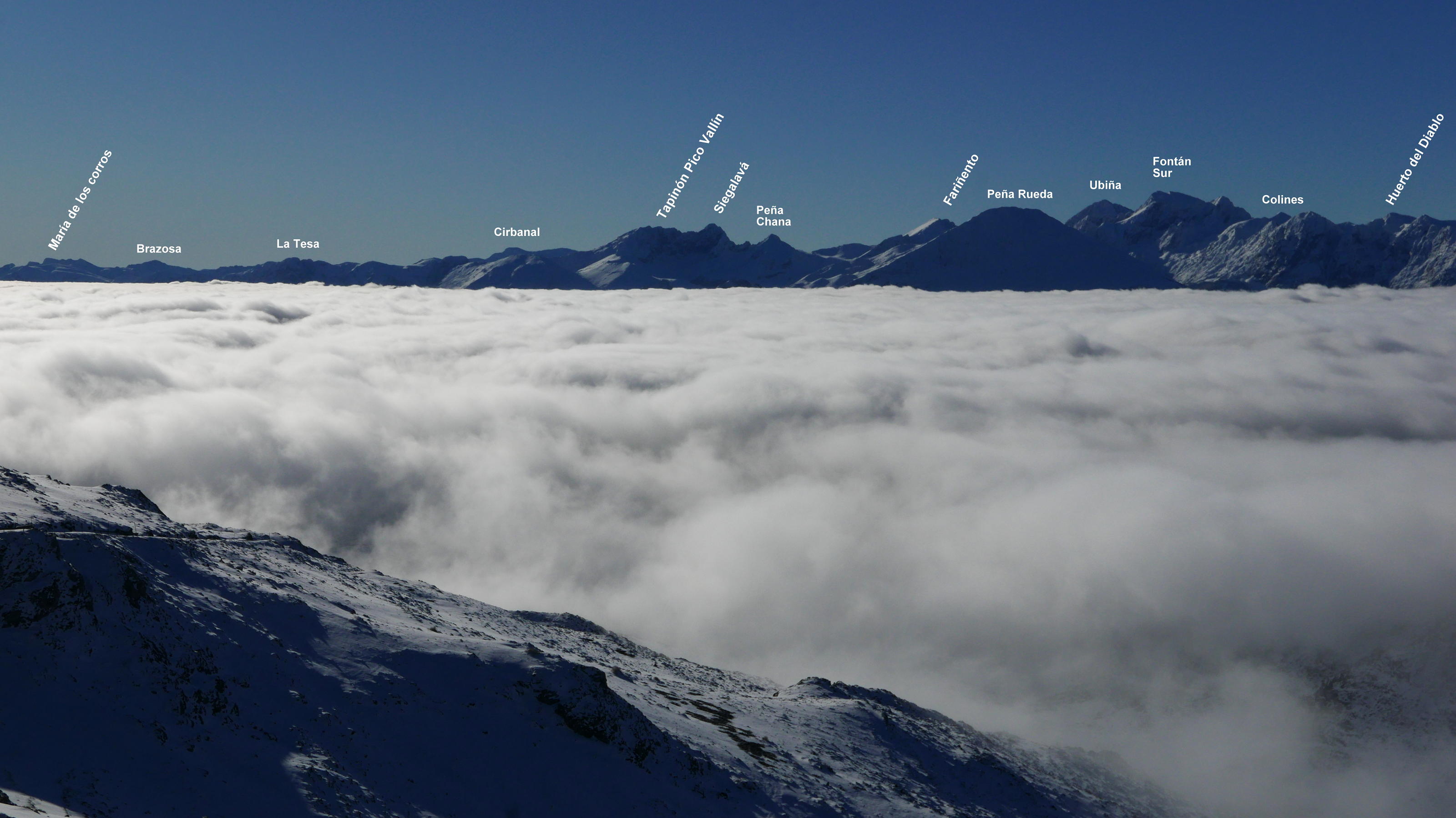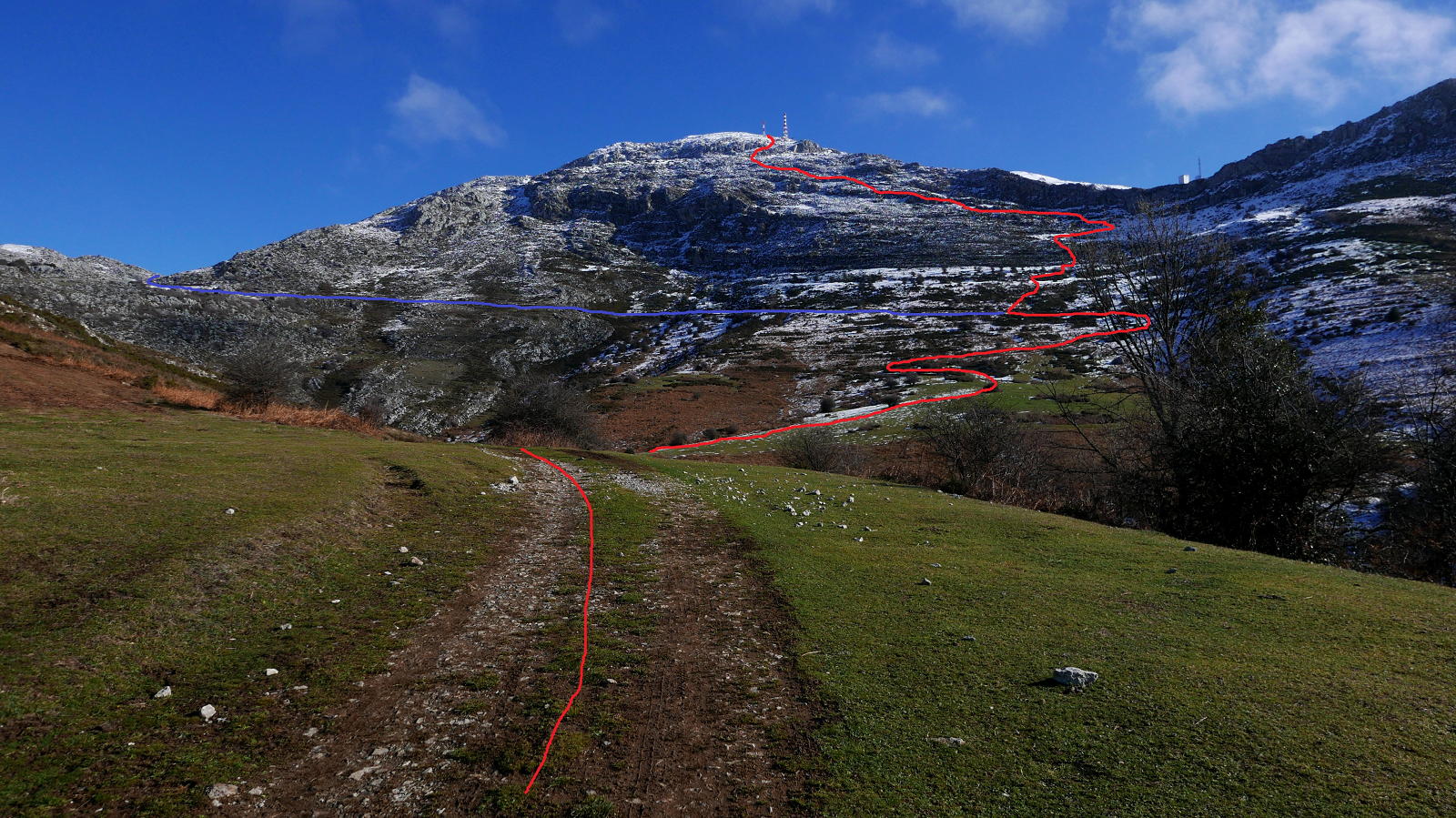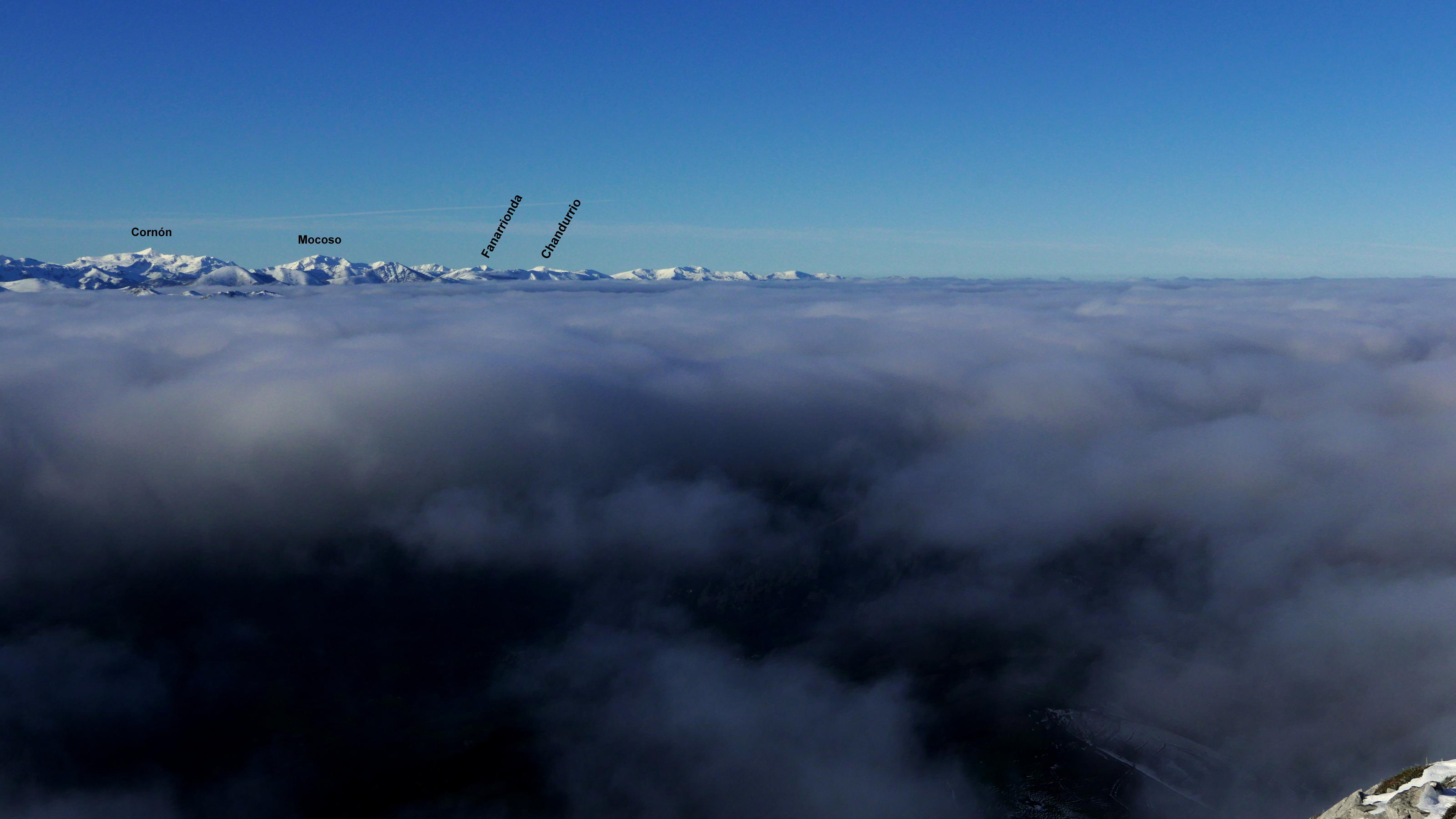 Parece que hay traza de senda que se dirige hacia el collado entre el Gamoniteiro y Peña Podre, pero entre la nieve y la vegetación no se distingue y voy subiendo intuitivamente por donde me parece el mejor trazado. Además la niebla empieza a cerrar la visibilidad. Antes de llegar a una pared rocosa me voy yendo a la izquierda por lo que parece un paso más cómodo y asciendo por traza de senda a un hombro (1560m 1h19′) y tengo una alambrada a mi derecha. Desde aquí asciendo ya directamente, con nieve a veces profunda y a paso lento, hasta la carretera que sube al Gamoniteiro, justo bajo las antenas. Aparece el sol y descubro una vista extraordinaria. Hago estos últimos metros por la carretera, con cuidado no vaya a estar helada, y asciendo al mogote donde está la cruz (Gamoniteiro 1791m 2h08′).