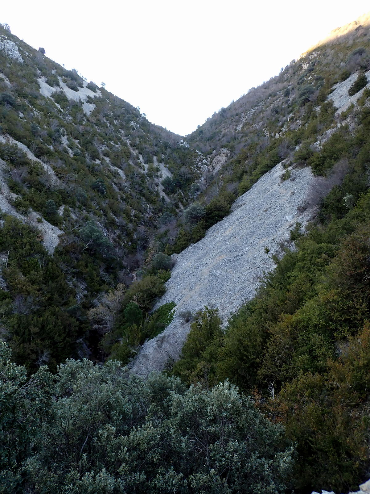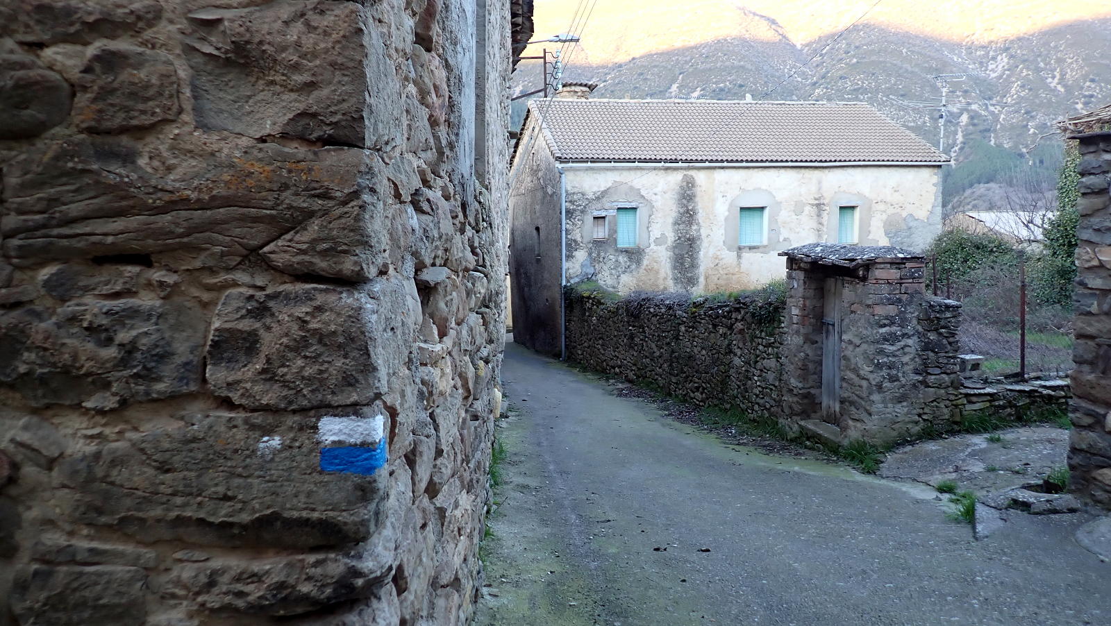 Descripción de la ruta: Desde la plaza de Bentué (910m) salgo hacia el sur por una calle que tiene señalización con pintura azul y blanca descendiendo entre campos hacia el río Garona. Hay un puente de tablones (875m 0h08′) (Cuando fui al Peiró seguí por la pista y tuve que vadear el río, no vi el puente). Continúa un camino ancho llaneando junto al cauce del barranco Cuna. Cruzo el lecho seco del barranco Cuna (945m 0h26′). Termina el camino ancho y comienza una senda (975m 0h32′) cuando me introduzco en el estrecho cañón, siempre siguiendo la balización en azul.