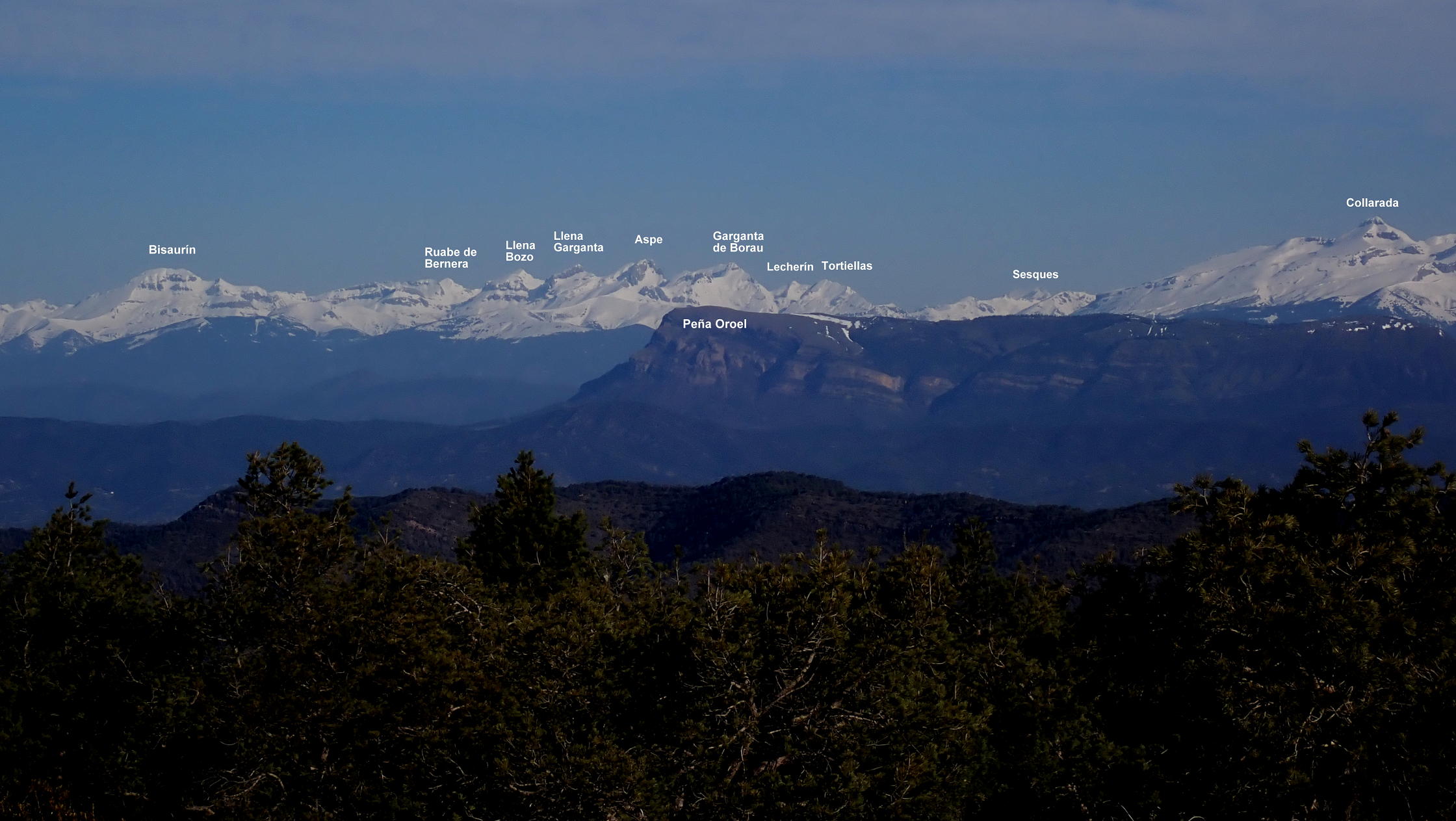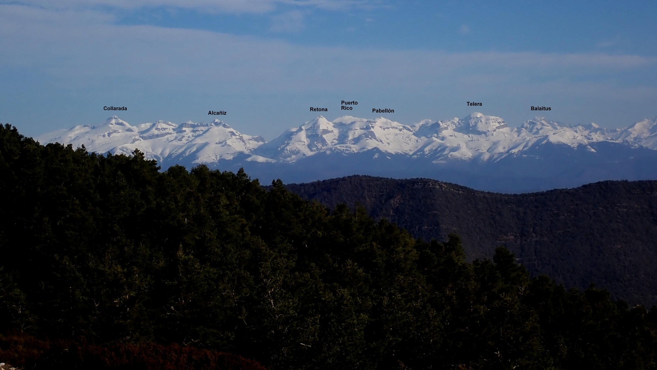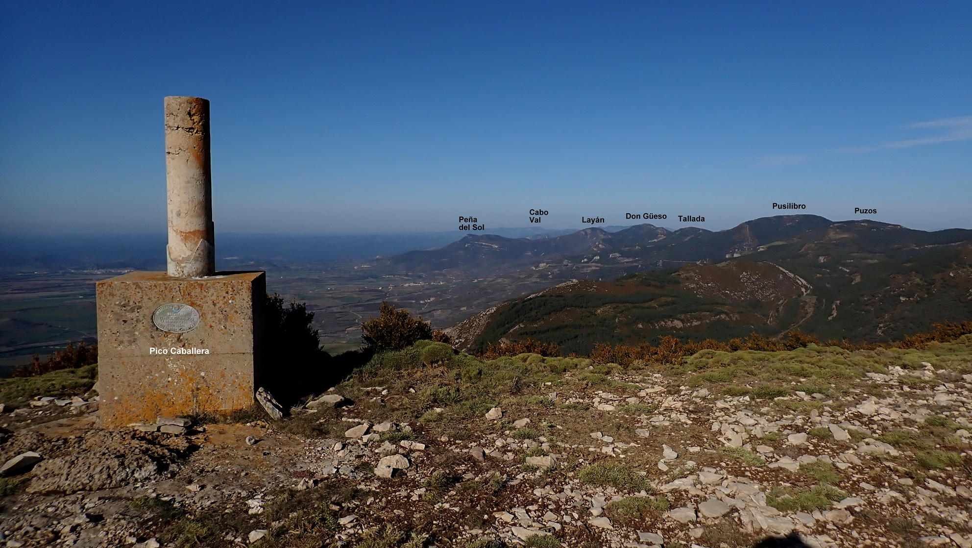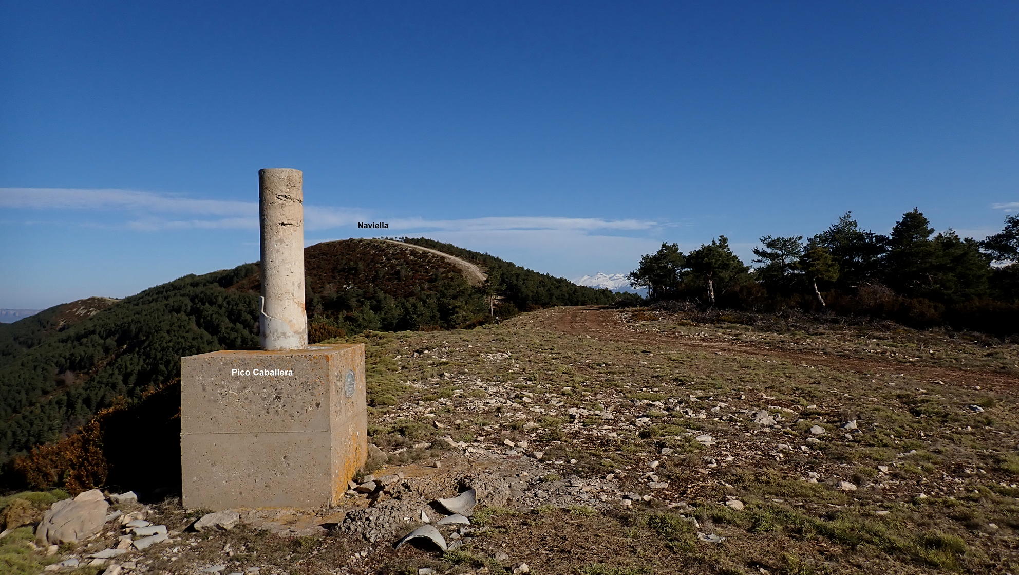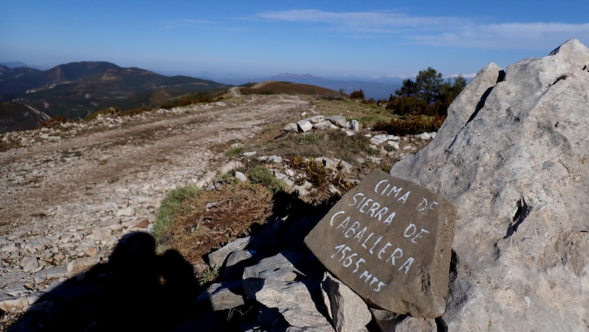 Aquí tomo una pista que sale hacia el NW. Enseguida se abren 3 caminos, tomo el camino central (1285m 1h30′) que claramente se dirige hacia la cresta de la sierra. Hay una fuerte pendiente, cruzo una pista (1370m 1h40′) y un poco más arriba desemboco en dicha pista (1435m 1h47′) para seguirla ya por el lomo de Sierra Caballera. Alcanzo el vértice geodésico denominado Naviella (1517m 1h55′), pero el punto más alto de la sierra está más adelante. En una piedra está escrito «Cima de Sierra Caballera» (1565m 2h06′). Espléndidas vistas del Pirineo completamente nevado.