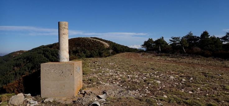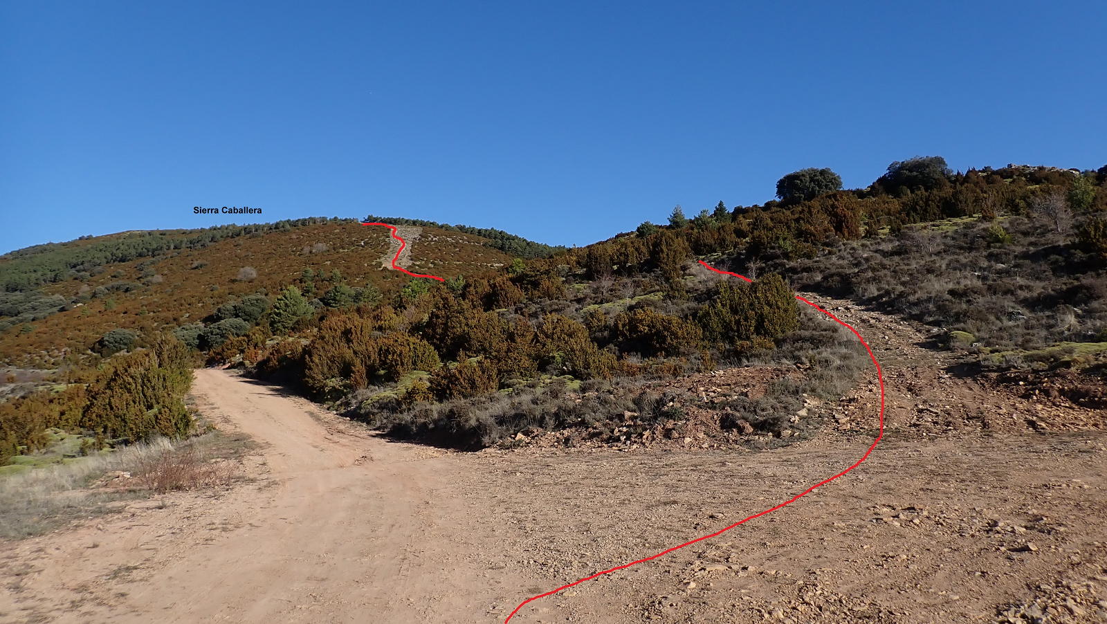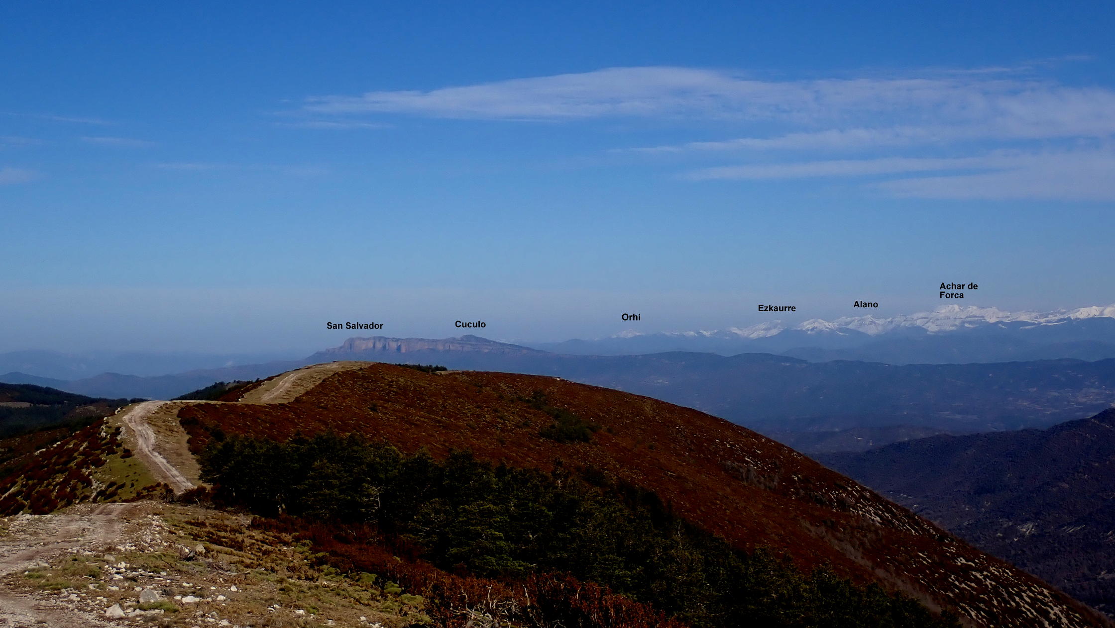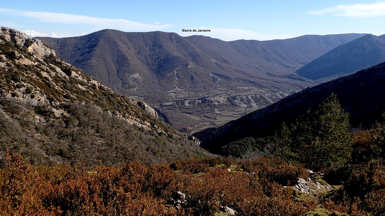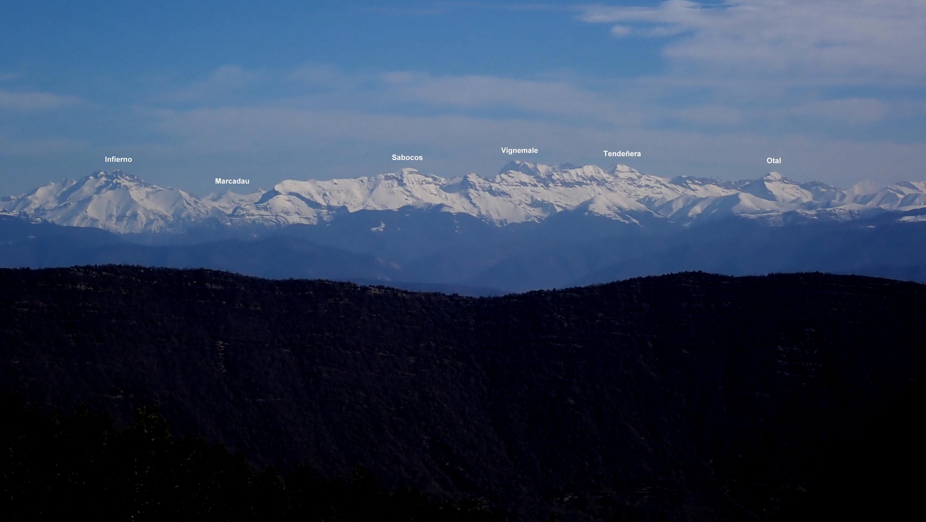Aquí tomo una pista que sale hacia el NW. Enseguida se abren 3 caminos, tomo el camino central (1285m 1h30′) que claramente se dirige hacia la cresta de la sierra. Hay una fuerte pendiente, cruzo una pista (1370m 1h40′) y un poco más arriba desemboco en dicha pista (1435m 1h47′) para seguirla ya por el lomo de Sierra Caballera. Alcanzo el vértice geodésico denominado Naviella (1517m 1h55′), pero el punto más alto de la sierra está más adelante. En una piedra está escrito «Cima de Sierra Caballera» (1565m 2h06′). Espléndidas vistas del Pirineo completamente nevado.