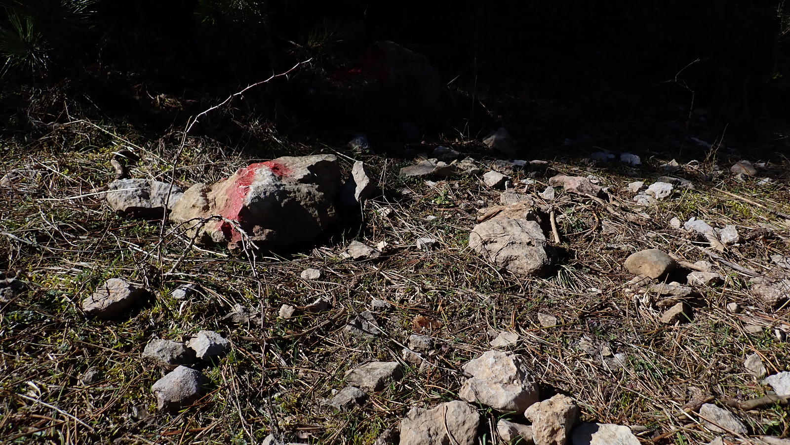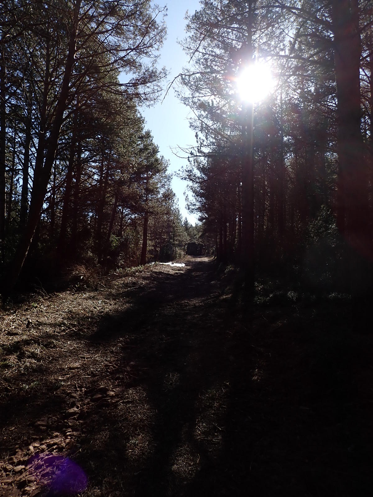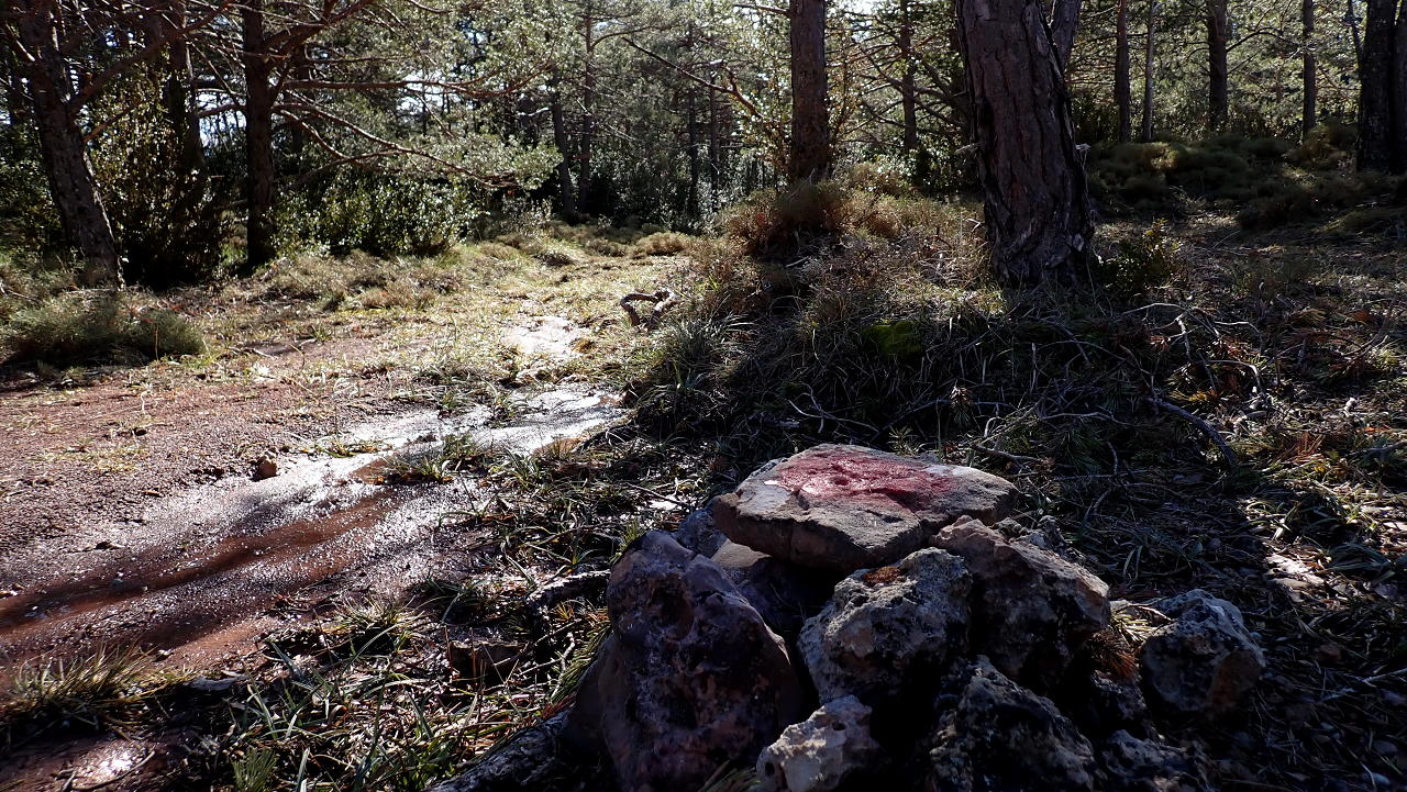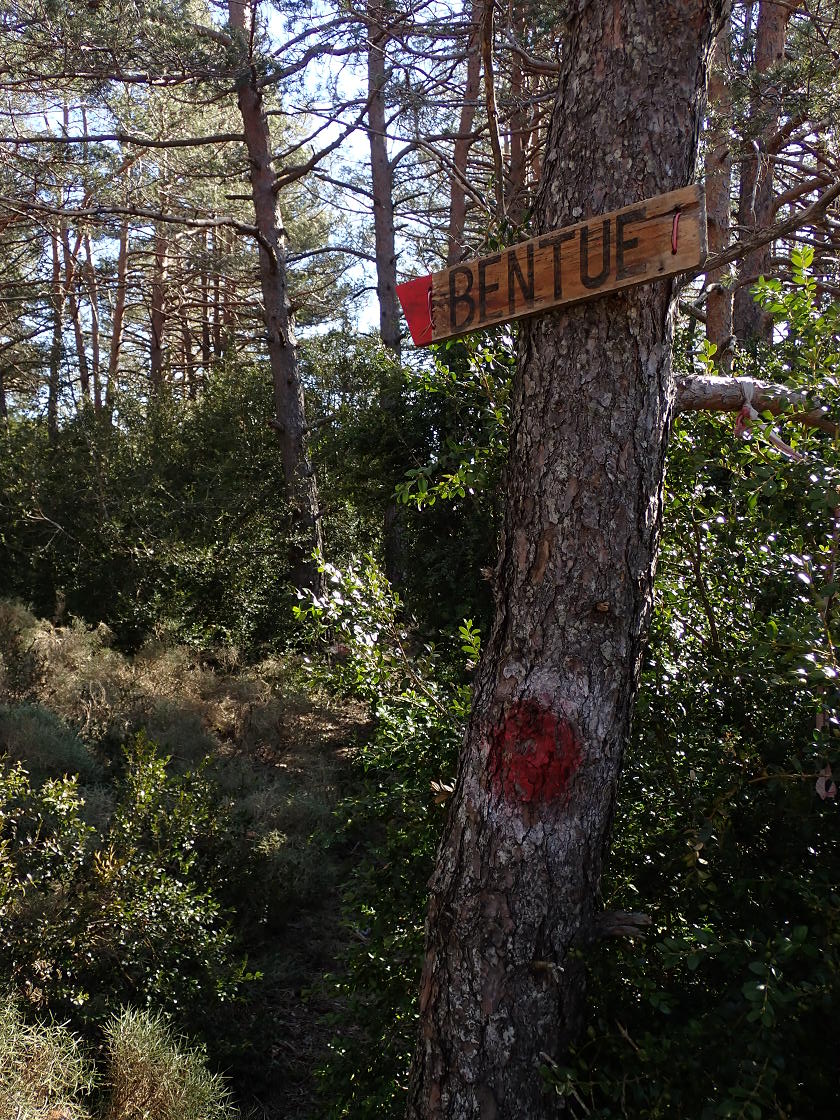 Sigue la pista recorriendo el lomo hacia el NW hasta que gira bruscamente a la izquierda (1515m 2h26′). Comienza el descenso por una pista en bosque de pinos. Hay que estar atento ya que en una zona llana más abierta debo dejar la pista (1375m 2h50′) para buscar una senda a mi derecha. Hay un hito con pintura roja, una chapa roja en el tronco de un pino y una estaca también con pintura roja. Luego un cartel de madera en otro pino que pone Bentué. El sendero discurre entre vegetación de boj bastante abundante, pero nunca llega a cerrarse y se sigue con facilidad.