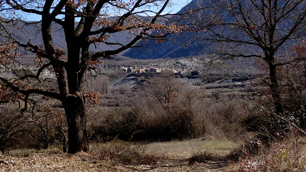 La senda desciende hasta introducirse en el barranco de la Foz de Portiella. Bonita bajada hasta tener la vista del valle del Garona y el pueblo de Bentué allá abajo. Sigue el descenso con pendiente más suave hasta desembocar en un camino ancho (910m 3h42′) (hay una flecha roja que indica la entrada a la senda en caso de subir por aquí).